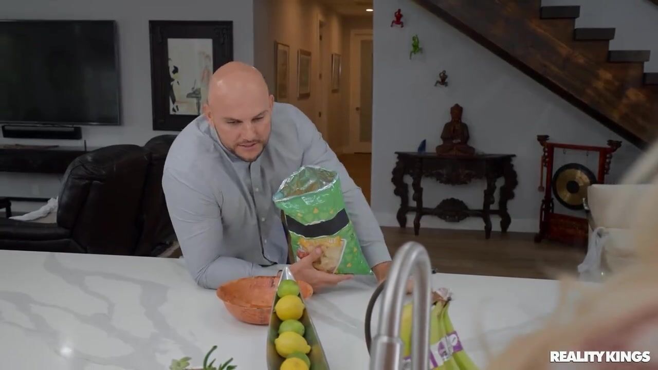 Horny sluts Bailey Base and Sarah Lace time their arrival at Jmac's for just after his wife leaves, sneaking into his backyard to flash their tits and shake their booties through the door till he lets them in. Jmac carries both hot brunettes to the ottoman and stacks them so he can easily lick both pussies at once. But while Bailey's in the kitchen and Sarah's in the bathroom, Jmac's wife comes home! He has to hide his naughty cheating by tucking Bailey into a cupboard after she gives him a sneaky behind-the-counter bj, then hiding Sarah in the laundry bag and carrying her out under his wife's nose! Finally he gets them safely into the bedroom where he can fuck them both as they lick each other's pussies, picking them up for a stand-and-carry and even lifting Sarah for a standing 69 before he cums on their faces.